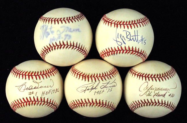 Description:Lot of (5) HOFers single-signed and inscribed baseballs (EX-EX/MT). Incl. G.Budig AL ball signed by George Brett with "#5" inscription; L.Coleman NL ball signed by Andre Dawson with "The Hawk" "#10" inscriptions ("blem" whited out on side panel); G.Budig AL ball signed by Bob Doerr with "#1" "HOF 1986" inscriptions; L.Coleman NL ball signed by Monte Irvin with "HOF 73" inscription; and L.Coleman NL ball signed by Ralph Kiner with "HOF 75" inscription. Signatures rate 7 (Irvin) to 9/10 (avg 8) out of 10. All shows areas of light to moderate toning: EX-EX/MT