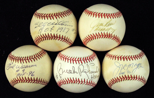 Description:Lot of (5) HOFers single-signed and inscribed baseballs (EX-EX/MT). Incl. W.White NL ball signed by Joe Morgan with "HOF 90" inscription; G.Budig AL ball signed by Jim Rice with "AL MVP 78" inscription; G.Budig AL ball signed by Brooks Robinson with "#5" "HOF 83" inscriptions ("blem" erased on side panel); L.Coleman NL ball signed by Billy Williams with "HOF 1987" "#26" inscriptions; and G.Budig AL ball signed by Earl Weaver with "#4" "HOF 96" inscriptions. Signatures rate 6/7 (Rice) to 9/10 (avg 8) out of 10. All shows areas of light to moderate toning / surface wear: EX-EX/MT