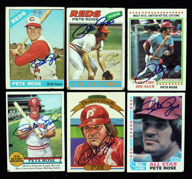 Description:Lot of (53) Pete Rose signed baseball cards from 1966-1987 (GD-EX/MT). Most appear to be from the late 1970s to early 1980s. Includes a rookie reprint card signed "The Real Pete Rose". Signatures rate 6/7 to 10 (avg 8/9) out of 10. Most cards appear to grade VG-VG/EX overall. Range: GD-EX/MT