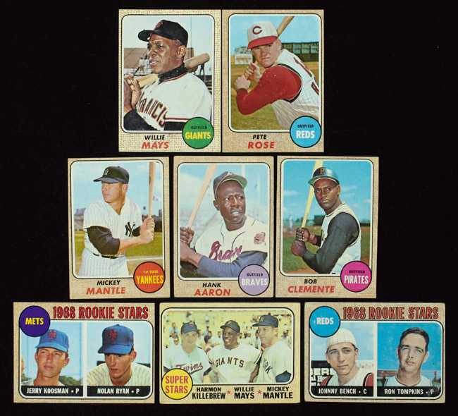 Description:1968 Topps Baseball complete (598)-card set (EX overall). Key cards grade: #s 45 Seaver VG), 50 Mays (VG/EX), 80 Carew (EX/MT), 110 Aaron (GD/VG), 150 Clemente (EX), 177 Ryan (EX (OC)), 230 Rose (VG), 247 Bench (VG), 280 Mantle (EX), 330 Maris (NM), 480 Manager's Dream (EX/MT), and 490 Super-Stars (VG-VG/EX). Remainder of the set grades EX overall with some lesser or better grade.