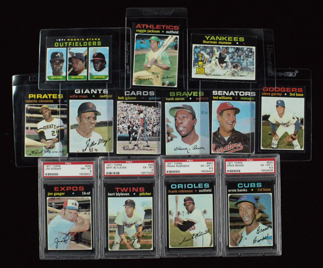 1971 Topps Baseball complete (752)-card set with (14) PSA graded (VG-NM/MT). Includes (1) graded PSA 8 NM-MT - #284. (9) graded PSA 7 NM - #s 575, 655, 675, 681, 683, 687, 690, 695, and 699. (3) graded PSA 6.5 EX-MT+ - #s 525 Banks, 640 Robinson, and 673. And (1) graded PSA 6 EX-MT - #26 Blyleven. Key cards grade - #s 5 Munson (EX), 20 Jackson (VG-VG/EX), 100 Rose (VG), 160 Seaver (EX-EX/MT), 250 Bench (EX/MT), 341 Garvey (EX), 380 Williams (EX/MT), 400 Aaron (EX/MT (OC)), 450 Gibson (EX/MT), 513 Ryan (EX miscut), 600 Mays (EX (OC)), 630 Clemente (NM (OC)), and 709 Baker/Baylor (VG/EX). Remainder grade EX overall with some lesser or better grade. Range VG-NM/MT