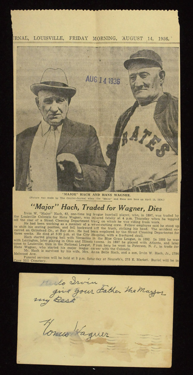 Description:Honus Wagner signed government postcard sent to "Major" Hach's son (VG/EX). Postmarked 1950 GPC signed by Wagner in black ink. Wagner added "Hello Irvin, Give your father the major (sic) my best." There is some scattered moisture spotting on the GPC, but the signature and writing rate 7/8 out of 10 overall. Irvin Hach, who the GPC is addressed to, was the son of Irvin "Major" Hach, whom Wagner was traded for in 1897. Includes a newspaper clipping showing Wagner and Hach together: VG/EX