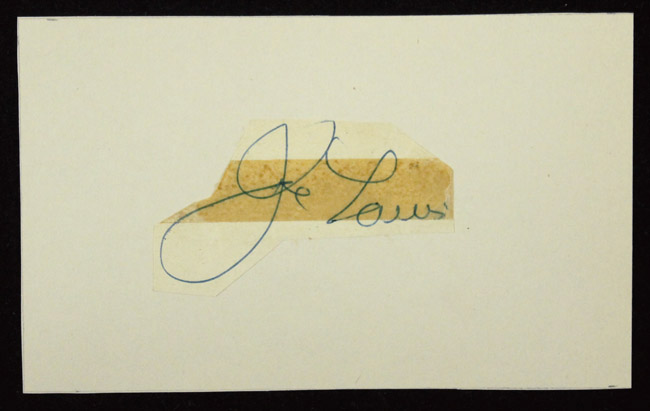 Description:Joe Louis cut signature affixed to 3"x5" paper (EX). Louis signed the cut in blue ink. Signature rates 8 out of 10, with period tape placed over the autograph: EX