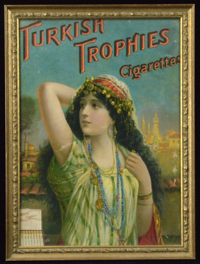 Description:Turkish Trophies advertising display c.1910s (Technical VG-VG/EX) Period large format advertising display featuring a young woman in middle eastern attire titles, "Turkish Trophy Cigarettes." Light to moderate scattered wear incl. scattered dings with more pronounced scuff at right edge. Light consistent age toning with stain (approx. 3.5"x3") on left edge. Framed to 20.5"x27.5" overall: Techinical VG-VG/EX with better display value ($400-$600)