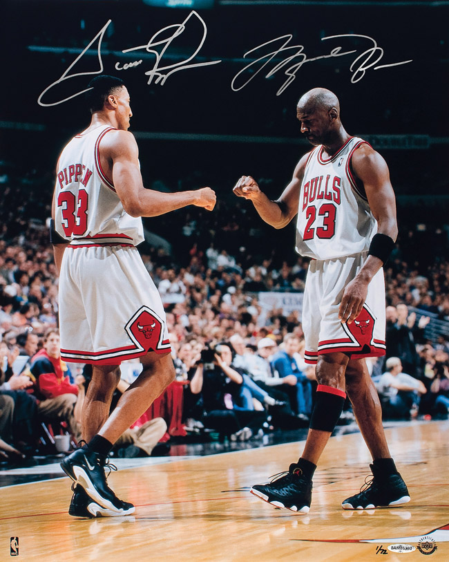 Description:Michael Jordan and Scottie Pippen dual-signed limited edition photograph, UDA (NM). 16"x20" photo limited to an edition of 72. Each player's signature is guaranteed authentic by virtue of the Upper Deck patented five-step authentication process. Comes with COA from UDA (serial #ed hologram sticker is affixed). Please note that the item will be shipped directly from Upper Deck, not from our location here at Hunt Auctions: NM
