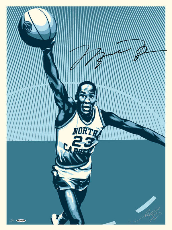 Description:Michael Jordan signed limited edition "North Carolina" 24"x36" silkscreen print also signed by artist Shepard Fairey, UDA (NM). Special North Carolina themed Michael Jordan print by artist Shepard Fairey. Large, 24'x36' silkscreen print is signed by Jordan as well as the artist. Limited edition of 50. Comes with COA from UDA (serial #ed hologram sticker is affixed). Please note the size, because the item will be shipped directly from Upper Deck, not from our location here at Hunt Auctions: NM