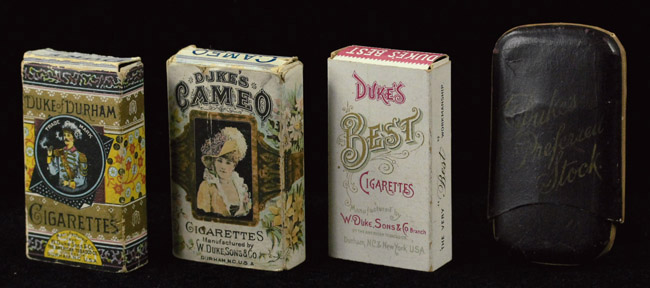 Description:Lot of (4) empty "Duke's" cigarette boxes (VG-EX) Includes Duke's Preferred Stock, Duke's Best, Duke's Cameo, and Duke of Durham. Varying degree of ane toning and wear throughout with some isolated chipping/surface loss: VG-EX ($100-$200)