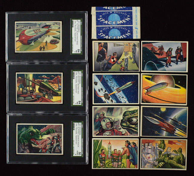 Description:1951 Bowman Jets, Rockets, and Spacemen complete set of (108) cards with unopened pack (Set range VG-NM with a few lesser, mostly EX and EX/MT, Pack VG-VG/EX) Unopened pack displays a hint of light wear with some toning and has become hard (it is likely that the gum is well adhered to card inside). Set includes (3) graded cards: #30 Slaying Deimos Rock SGC 50 VG/EX and #s (3) To The Launching Ring and (23) Rocket Repair both graded SGC 84 NM. Varying degrees of light to moderate corner/edge wear throughout with approx. Only a few cards fall at either extreme of stated condition range with most (10) cards having some (mostly light) creasing. As is common to many issued of this era, approx. (25%) have some residue on back from the gum which they originally came with. Also includes the 1985 extended set of cards numbered 145-180: Set range VG-NM with a few lesser, mostly EX and EX/MT, Pack VG-VG/EX ($750-$1,000)