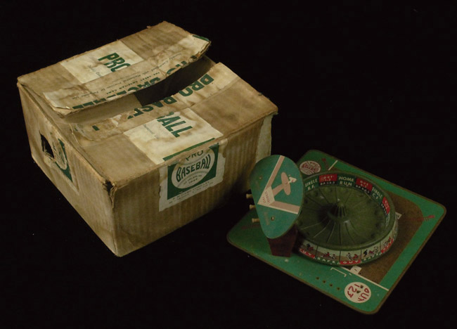 Description:Vintage "Pro Baseball" game with its original box, c.1944 (EX/MT). Popular roulette style baseball game remains clean overall, with numbers written for each base (EX/MT). Includes its original box which shows handling and storage wear. Game: EX/MT