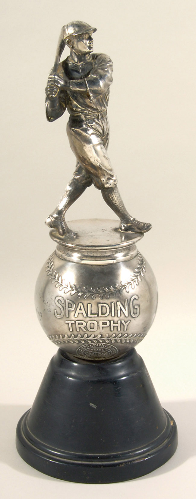Description:Spalding figural baseball trophy c.1920s (VG/EX) Seldom offered figural trophy is one of the most appealing of the genre standing a full 20" tall. Circular wooden base supports a large cast metal baseball which is lettered "Spalding Trophy" on the front with the company logo below. Atop is a detailed batter in swing follow through. Light wear to base with a touch of surface loss. Metal portion displays moderate tarnish. Batter's bat is slightly bent at center and a repair has been executed at the front foot to reaffix batter to base: VG/EX