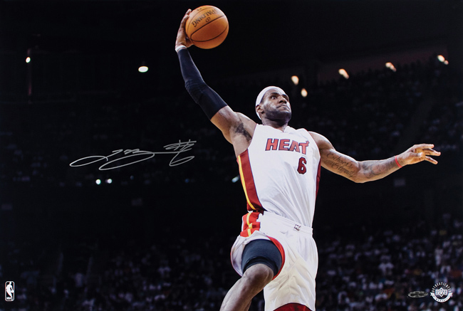 Description:LeBron James signed limited edition "Glide Dunk" 16"x24" photograph, UDA (NM/MT). This stunning 16"x24" photograph of LeBron James in action for the Miami Heat is personally signed by James in silver paint pen. Limited to only 50. Signature is guaranteed authentic through Upper Deck Authenticated's patented five-step process. Comes with COA from UDA (serial #ed hologram sticker is affixed). Please note that the item will be shipped directly from Upper Deck, not from our location here at Hunt Auctions, and the photo is a stock image: NM/MT