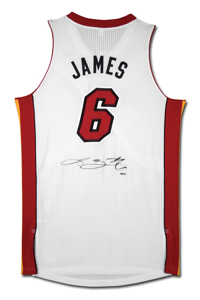 Description:LeBron James signed Miami Heat authentic Reebok white home jersey, UDA (NM/MT). James signed the jersey in black marker. Upper Deck Authenticated guarantees the authenticity of his signature on this Miami Heat jersey through their patented authentication process. Comes with COA from UDA (serial #ed hologram sticker is affixed). Please note that the item will be shipped directly from Upper Deck, not from our location here at Hunt Auctions, and the photo is a stock image: NM/MT
