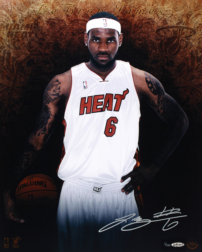 Description:LeBron James signed "Welcome to Miami" 16"x20" photograph, UDA (NM/MT). To celebrate his much-publicized decision to take his talents to Miami, Upper Deck Authenticated has unveiled this impressive, autographed 16"x20" photo showing James in his home uniform for the Heat. His signature is guaranteed authentic through Upper Deck Authenticated's patented five-step process. Comes with COA from UDA (serial #ed hologram sticker is affixed). Please note that the item will be shipped directly from Upper Deck, not from our location here at Hunt Auctions, and the photo is a stock image: NM/MT