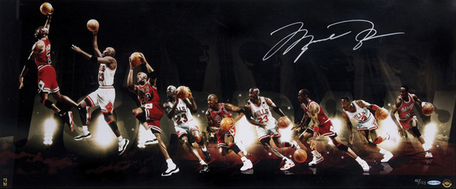 Description:Michael Jordan signed limited edition "Chronology" display, UDA (NM/MT). Unique, multi-image photo collage that offers a captivating look at Michael Jordan through the years. Guaranteed authentic Jordan signature stands out impressively in silver, over dark background area. Measures approximately 36" wide x 15" high. Edition size limited to just 123. Comes with COA from UDA (serial #ed hologram sticker is affixed). Please note that the item will be shipped directly from Upper Deck, not from our location here at Hunt Auctions, and the photo is a stock image: NM/MT