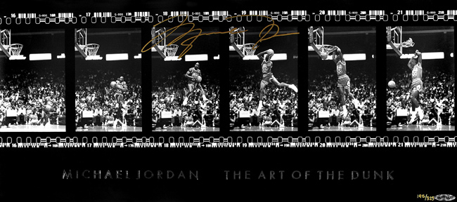 Description:Michael Jordan signed limited edition "Art of the Dunk" filmstrip photograph, UDA (NM/MT). When the NBA holds its annual All-Star Weekend festivities, Michael Jordan's amazing performance at the 1988 Slam Dunk Championship is often recalled. At that year's All-Star event in Chicago, Jordan won the popular dunk competition for the second year in a row. Upper Deck commemorates Jordan's memorable '88 dunking exhibition with this autographed and limited-edition black-and-white filmstrip piece. Measures approximately 10" wide x 22" high, provides a frame-by-frame account of one of his highlight-reel dunks. Limited to 323. Jordan's signature is guaranteed authentic by Upper Deck Authenticated's patented five-step process. Comes with COA from UDA (serial #ed hologram sticker is affixed). Please note that the item will be shipped directly from Upper Deck, not from our location here at Hunt Auctions, and the photo is a stock image: NM/MT