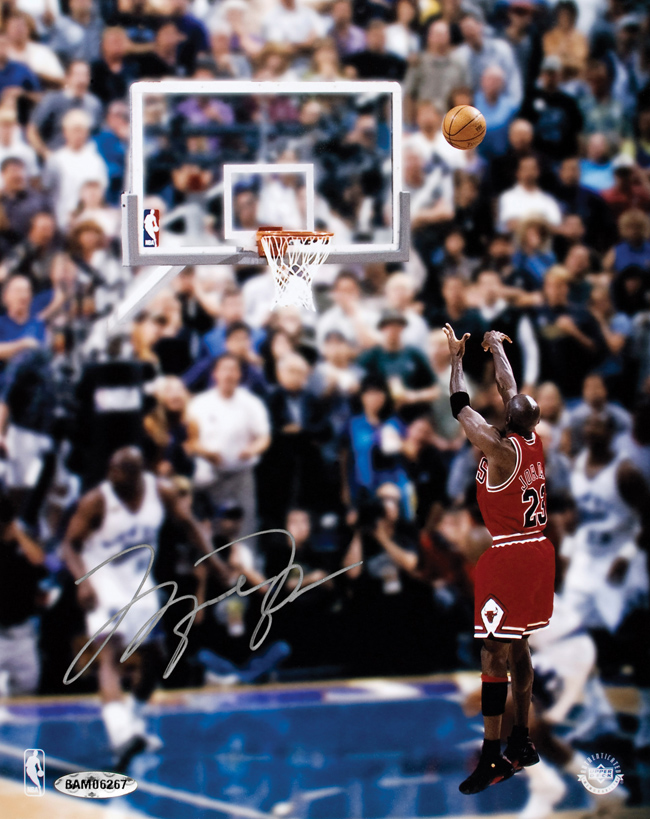 Description:Michael Jordan signed 8"x10" "Last Shot" photograph, UDA (NM/MT). Jordan signed the photo in silver marker. Jordan's signature is guaranteed authentic by Upper Deck Authenticated's patented five-step process. Comes with COA from UDA (serial #ed hologram sticker is affixed). Please note that the item will be shipped directly from Upper Deck, not from our location here at Hunt Auctions, and the photo is a stock image: NM/MT