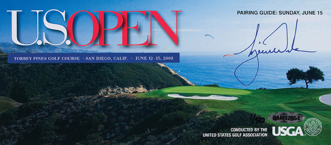 Description:Tiger Woods signed 2008 US Open Sunday Pairing Guide, UDA (NM/MT). The 2008 U.S. Open Championship at Torrey Pines Golf Course will go down as one of the most exciting professional golf tournaments in history. Tiger Woods defeated Rocco Mediate in a thrilling 19-hole playoff. Upper Deck commemorates his hard-earned 14th major victory with this collectible Sunday Pairing Guide autographed by Tiger Woods. Comes with COA from UDA (serial #ed hologram sticker is affixed). Please note that the item will be shipped directly from Upper Deck, not from our location here at Hunt Auctions, and the photo is a stock image: NM/MT