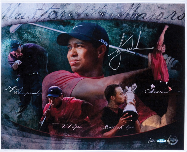Description:Tiger Woods signed limited edition "Masters of the Majors" 16"x20" photo montage, UDA (NM/MT). Tiger Woods has won all of golf's majors. This beautifully designed montage (limited to 100) shows a focused Woods, surrounded by striking images from four of his past major triumphs. His signature is guaranteed authentic by virtue of the Upper Deck patented five-step authentication process. Comes with COA from UDA (serial #ed hologram sticker is affixed). Please note that the item will be shipped directly from Upper Deck, not from our location here at Hunt Auctions, and the photo is a stock image: NM/MT