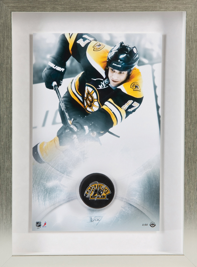 Description:Milan Lucic "Ice Charge Series" framed display with signed hockey puck, limited to 25, UDA (NM/MT). This 11"x17" limited edition image of Lucic is accompanied by his autographed Boston Bruins hockey puck. This piece is beautifully displayed in a silver frame with a white mat. Lucic+s signature is guaranteed authentic through Upper Deck Authenticated's patented five-step process. Comes with COA from UDA (serial #ed hologram sticker is affixed). Please note that the item will be shipped directly from Upper Deck, not from our location here at Hunt Auctions, and the photo is a stock image: NM/MT