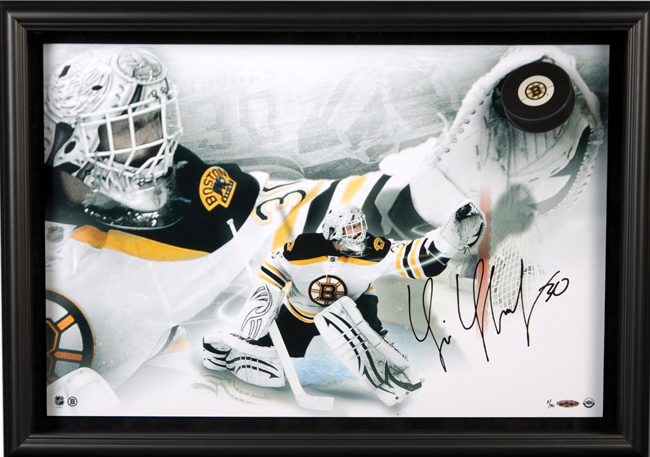 Description:Tim Thomas signed limited edition Breaking Through display with Bruins puck "breaking through" the Plexiglas, UDA (NM/MT). Thomas helped lead the Boston Bruins to the 2011 Stanley Cup Championship. This patented framed Breaking Through display contains a Boston Bruins logo puck breaking through the plexiglass. Limited to 30, this 28"x20" autographed piece shows Tim Thomas making the save of a Boston Bruins puck to his right. His autograph has been authenticated by virtue of UDA's patented authentication process. Comes with COA from UDA (serial #ed hologram sticker is affixed). Please note that the item will be shipped directly from Upper Deck, not from our location here at Hunt Auctions, and the photo is a stock image: NM/MT