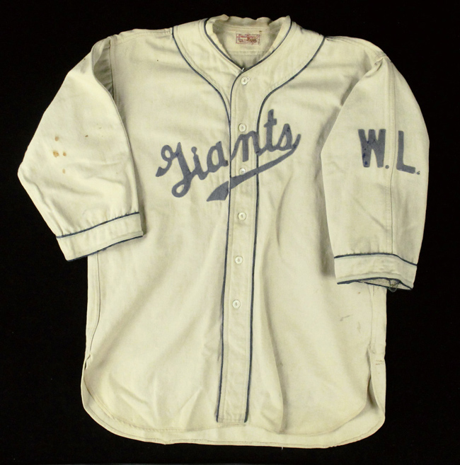 Description:Honus Wagner Co. baseball jersey, c.1920s-30s (EX). Button-up jersey with felt "Giants" sewn across the front, and felt "W.L." sewn on left sleeve. Honus Wagner Co tag is sewn in the collar. Exhibits typical age wear with areas of fabric fraying, faded felt, and a few stains: EX