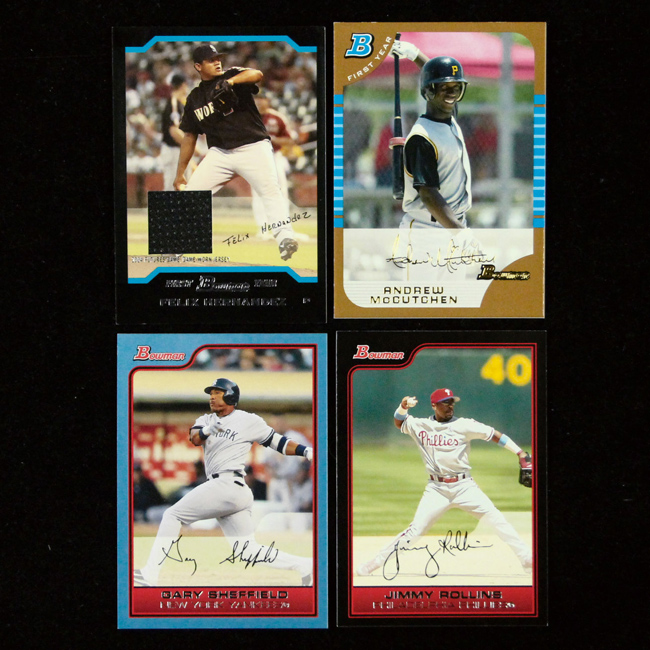 Lot of (15) Bowman Baseball sets & partial sets from 2004-06, plus extras (NM overall). Incl. 2004 Bowman set; 2004 Bowman 1st Edition set; 2004 Bowman Draft Picks & Prospects set; 2004 Bowman Draft Picks & Prospects Gold parellel set; (20) 2004 Bowman Draft Picks & Prospects game worn swatch cards including Felix Hernandez, Robinson Cano, B.J. Upton, David Wright, Delmon Young, and others; 2005 Bowman set; 2005 Bowman 1st Edition set; 2005 Bowman Gold parallel set; 2005 Bowman Draft Picks & Prospects set; 2005 Bowman Draft Picks & Prospects Gold parallel set; (29) 2005 Bowman Draft Picks & Prospects game worn swatch cards including Francisco Liriano, Delmon Young, B.J. Upton, Jose Bautista, and others; (14) 2005 Bowman "Signs of the Future" signed insert cards; (220) 2006 Bowman cards (#s 1-220); (110) 2006 Bowman Prospects (#s 1-110); (220) 2006 Bowman Gold parellel cards (#s 1-220); (110) 2006 Bowman Prospects Gold parallel cards (#s 1-110); (220) 2006 Bowman Blue parallel cards (#s 1-220); and (110) 2006 Bowman Prospects Blue parallel cards (#s 1-110). Most cards appear to grade NM overall. Range: VG-NM/MT