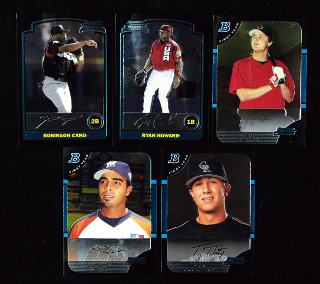 Lot of (10) Bowman Chrome base card sets from 2003-2006, including refractor base sets (NM overall). Incl. (165) 2003 Bowman Chrome Draft Picks & Prospects (#s 1-165) including #s 124 Robinson Cano (NM), 138 Ryan Howard (NM-NM/MT); (330) 2004 Bowman Chrome (#s 1-330); (330) 2004 Bowman Chrome Refractors (#s 1-330); (165) 2004 Bowman Chrome Draft Picks & Prospects (#s 1-165); (330) 2005 Bowman Chrome (#s 1-330); (165) 2005 Bowman Chrome Draft Picks & Prospects (#s 1-165) including #s 32 Jay Bruce (NM-NM/MT), 105 Troy Tulowitzki (NM/MT), 165 Nelson Cruz (NM/MT); (220) 2006 Bowman Chrome (#s 1-220); (220) 2006 Bowman Chrome Refractors (#s 1-220); and (220) Bowman Chrome Prospects (#s 1-220). Most cards appear to grade NM overall. Range: VG-NM/MT