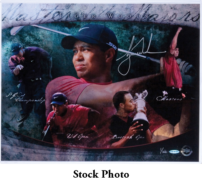 Description:Tiger Woods signed limited edition "Master of the Majors" 16"x20" photo montage, UDA (NM/MT). Tiger Woods has won all of golf's majors. This beautifully designed montage (limited to 100) shows a focused Woods, surrounded by striking images from four of his past major triumphs. His signature is guaranteed authentic by virtue of the Upper Deck patented five-step authentication process. Comes with COA from UDA (serial #ed hologram sticker is affixed). Please note that the item will be shipped directly from Upper Deck, not from our location here at Hunt Auctions, and the photo is a stock image: NM/MT
