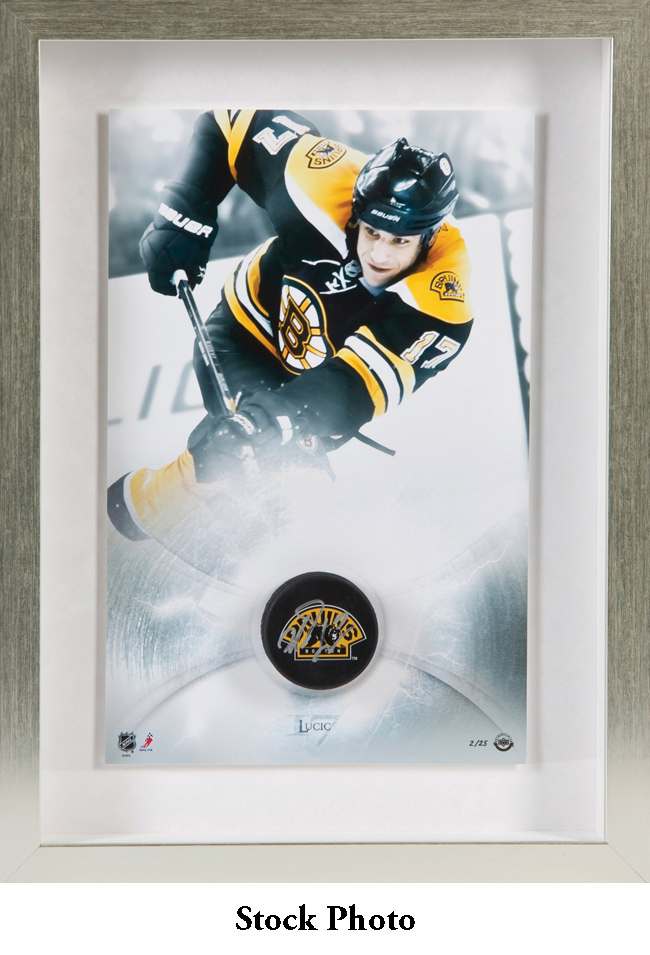 Description:Milan Lucic "Ice Charge Series" framed display with signed hockey puck, limited to 25, UDA (NM/MT). This 11"x17" limited edition image of Lucic is accompanied by his autographed Boston Bruins hockey puck. This piece is beautifully displayed in a silver frame with a white mat. Lucic's signature is guaranteed authentic through Upper Deck Authenticated's patented five-step process. Comes with COA from UDA (serial #ed hologram sticker is affixed). Please note that the item will be shipped directly from Upper Deck, not from our location here at Hunt Auctions, and the photo is a stock image: NM/MT