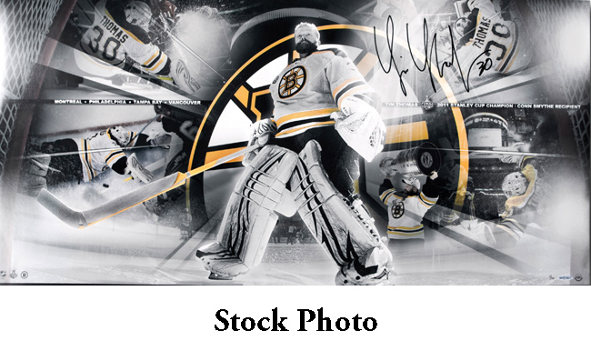 Description:Tim Thomas signed limited edition 36"x18" "Quest for the Cup" photograph, UDA (NM/MT). Limited to 50. The quest begins in the top left corner with the Montreal Canadians, which the Bruins defeated in a seven game series. Moving clockwise, the Philadelphia Flyers were next up for the Bruins, who they quickly disposed of in four games. The quest continued in the Eastern Conference Finals vs. the Tampa Bay Lightning. After a long, drawn out series, Tim Thomas posted a brilliant 1-0 shutout in game seven, sending the Bruins to the Stanley Cup for the first time since 1990. After falling behind 2-0 to the Vancouver Canucks in the finals, the Boston Bruins fought back, and captured four of the next five games, to win the 2011 Stanley Cup. His autograph has been authenticated by virtue of UDA's patented authentication process. Comes with COA from UDA (serial #ed hologram sticker is affixed). Please note that the item will be shipped directly from Upper Deck, not from our location here at Hunt Auctions, and the photo is a stock image: NM/MT