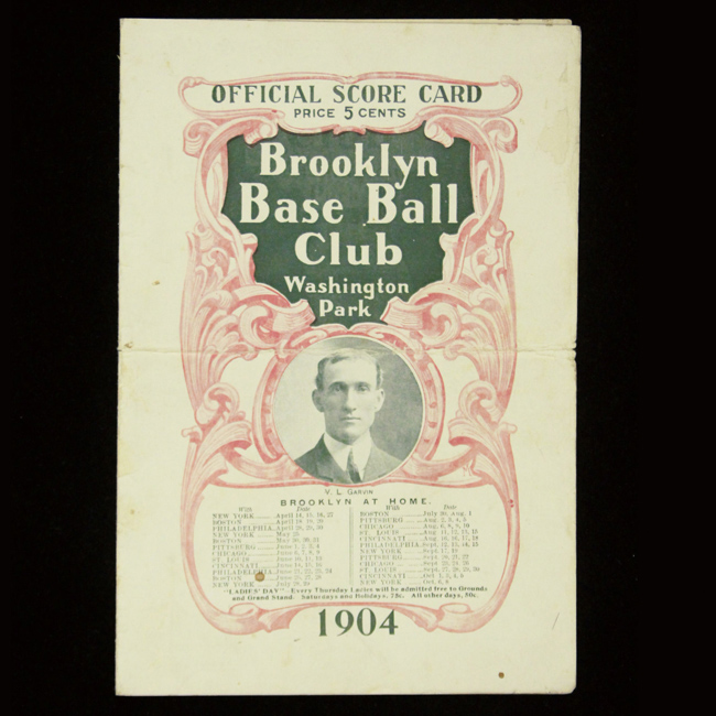 Description:1904 Brooklyn Superbas vs. Boston Beaneaters scorecard (Technical GD) Early heavy stock scorecard for game played at Washington Park picturing pitcher Ned Garvin on the cover at center of an elaborate design which has the seasons' schedule printed below. Pre-printed lineups include period notables Sheckard, Tenney, Delahanty, Moran, and Willis. Scored neatly in pencil. General wear throughout with major condition grade detractor being a horizontal fold at center. Unusually early and highly visual: Technical GD