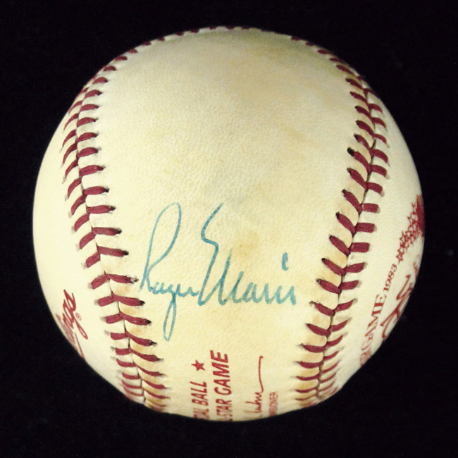 Description:Roger Maris single signed 1983 All Star Game baseball (Ball EX, Sig. NM) Rawlings Bowie Kuhn Official 1983 All-Star Game baseball has been signed on the side panel in customary position, "Roger Maris." Blue ink signature rates 8 out of 10. Ball displays moderate to slightly heavier toning throughout": Ball EX, Sig NM ($2,000-$3,000)